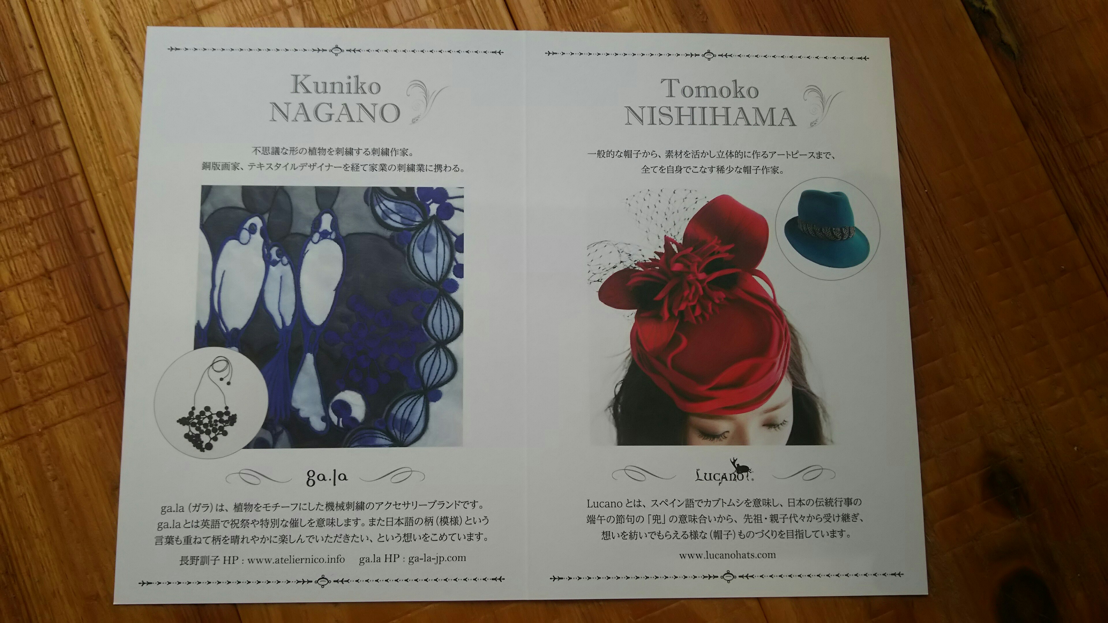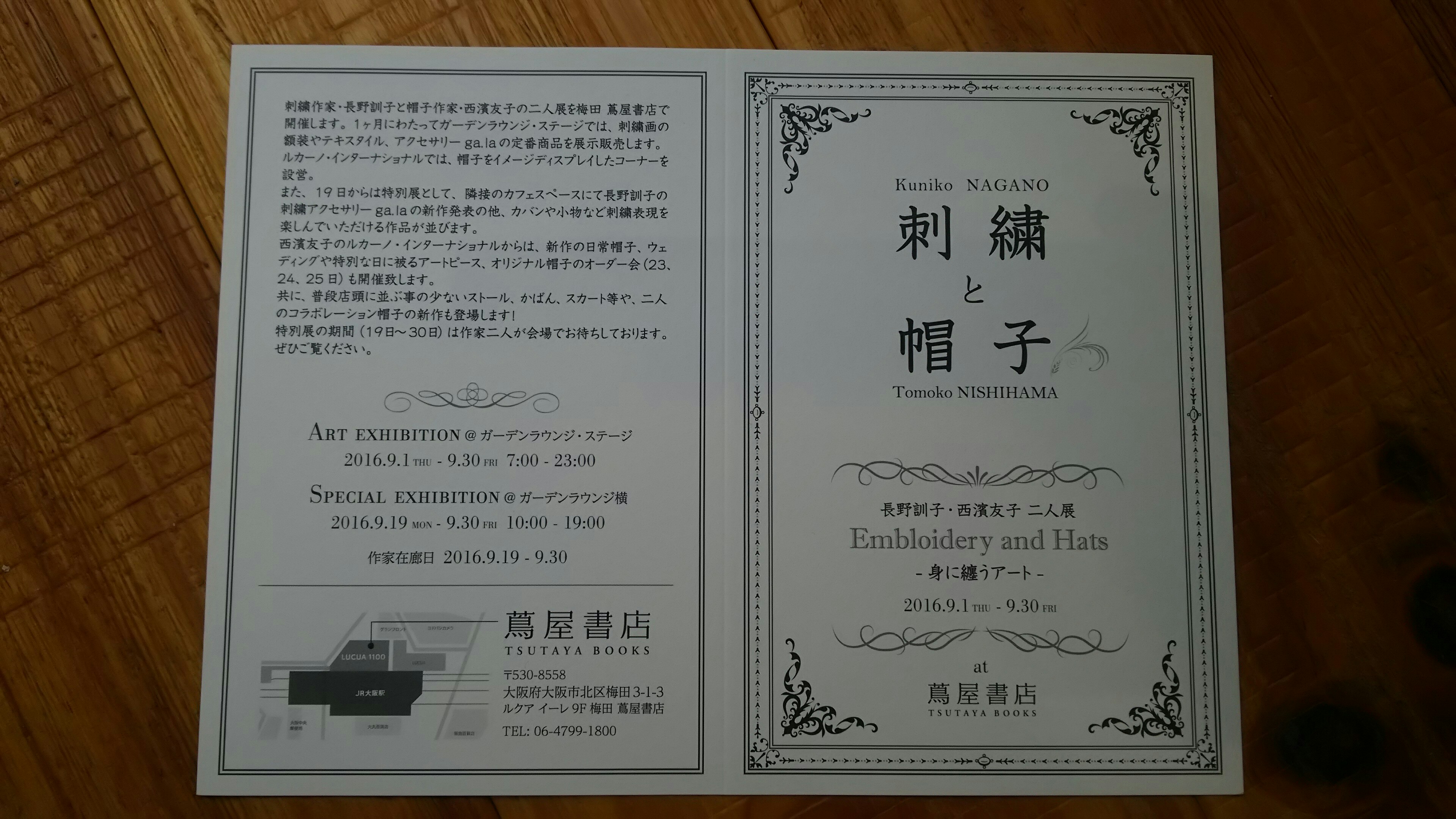 来月、9月19日(月)~9月30日(金)開店時間ー10時~19時、ルクアイーレ9階蔦屋書店@ガーデンラウンジ横にて、刺繍と帽子の販売会が行われます。刺繍のアーティスト、長野訓子さんと、私、西濱友子が開催する、久々の二人展となります。コラボレーション帽子はもちろんの事、楽しい作品が皆さまのお越しをお待ちしております。私達は毎日店頭に居りますので、お気軽にお声がけ下さいませ。皆さまとの良き出会いがありますように。